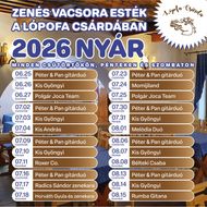 A Lópofa Csárda 2026-ban is hangulatos környezetben és hagyományos ízekkel biztosít kellemes élményt minden látogatónak. A nyári hónapokban különleges programokkal készülünk a vendégek számára. Minden csütörtökön, pénteken és szombaton nyári zenés vacsoraesteket tartunk. Ezeken az estéken a művészet és a gasztronómia egyedülálló módon találkozik, felejthetetlen hangulatot teremtve.
